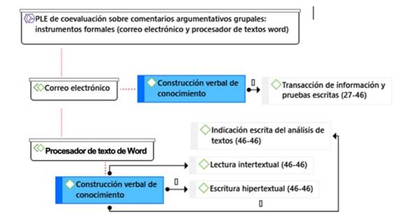 En las Figuras 8 y 9, que siguen, constan las síntesis esquemáticas del aprendizaje de coevaluación formativa sobre construcción de conocimiento mediante los recursos digitales formales empleados en el PLE de los participantes en la investigación: las secciones de Tareas y Recursos del Aula Virtual UM y los instrumentos recurrentes del correo electrónico institucional y del procesador de texto de Word.