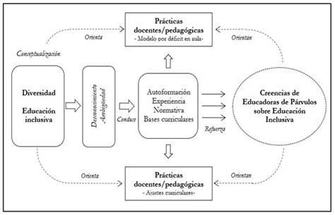 Las prácticas docentes y/o pedagógicas tienden a fundirse en dos elementos aparentemente centrales: 1) La autogestión de su propio conocimiento sobre la educación inclusiva, resultando en la conceptualización de una inclusión ambigua y compleja de internalizar de forma autónoma, 2) La implementación de prácticas en el límite de la inclusión, basadas en un sistema de creencias acerca de las NEE como una respuesta inspirada en un modelo médico y asistencialista que aún no desarrolla una identidad inclusiva como tal, puesto que aún sigue considerando esta diversidad de aula en términos de carencias, necesidades y no de potenciales o sobre la diversidad de niñas/niños en sí mismas/os (Figura 1).