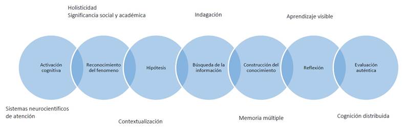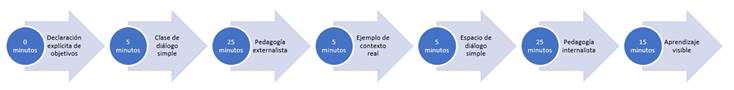 Se diseñaron las estrategias didácticas basadas en la evidencia empírica que surge desde la neurociencia, siendo los criterios para su esquematización la motivación (declaración del aprendizaje), la movilización de conocimientos previos (espacio de diálogo simple), la transposición didáctica del contenido (pedagogía externalista), la activación cognitiva (pedagogía internalista) y la autoorganización de la información (aprendizaje visible), para la estrategia pedagógica de ABM, siguiendo los tiempos (minutos) y etapas observadas en la Figura 1.