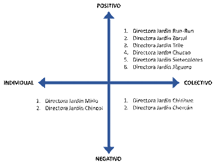 El análisis realizado da cuenta de una tipología que propone tres formas diferentes en que las directoras entrevistadas han abordado el desafío de la nueva institucionalidad en sus jardines infantiles. Esto se grafica en el cuadrante presentado en la Figura 1. El eje Y presenta cómo las directoras evalúan el proceso de transformación institucional que está viviendo el nivel, positiva o negativamente. El eje X muestra de qué forma las directoras están abordando el desafío de la transformación institucional, si lo realizan de manera individual, como una tarea solo de ellas, o de forma colectiva, integrando al equipo pedagógico en esta labor. De manera general, identificamos que el grupo mayoritario se encuentra en el primer cuadrante, positivo-colectivo. En el tercer y cuarto cuadrante, negativo-individual y negativo-colectivo, respectivamente, distribuidas equitativamente se agrupan el resto de las directoras que participaron de este estudio. A partir de las entrevistas realizadas, no identificamos a ninguna directora en el segundo cuadrante, positivo-individual.