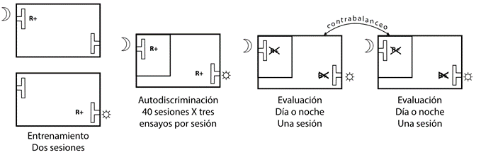 Autodiscriminación. Durante esta fase los organismos fueron trasladados hacia un área iluminada con luz incandescente de color ámbar de 70 lummens tanto en las sesiones diurnas como nocturnas. Esto con el propósito de evitar que las condiciones de iluminación durante la fase de autodiscriminación fueran el estímulo discriminativo y no el momento del día subjetivo. Las sesiones diurnas se realizaron en horarios de 9:00 a.m. hasta 12:00 p.m. y las nocturnas de 9:00 p.m. hasta 12:00 a.m. Al inicio de las sesiones de autodiscriminación los organismos se hallaban privados de agua durante nueve horas. Los sujetos tenían disposición libre de agua inmediatamente después de las sesiones, hasta llegar al periodo de privación de nueve horas, por lo que su peso no se vio afectado. Los sujetos recibieron .06 ml de agua si presionaban la palanca frontal derecha en la condición día subjetivo o la palanca trasera izquierda en la condición noche subjetiva. Durante las sesiones, 40 en total, cada organismo completó 15 minutos de actividad dentro de la caja de condicionamiento operante. Estos 15 minutos fueron divididos en tres ensayos de cinco minutos cada uno con intervalos de 45 minutos entre cada ensayo. Este procedimiento ha mostrado ser eficaz para incrementar el número de exposiciones del organismo en relación al estado subjetivo-estímulo arbitrario (Penagos-Corzo, Bonilla et al., 2015). El orden de participación fue rotado diariamente en función del número asignado a los sujetos para que se mantuviera balanceado.