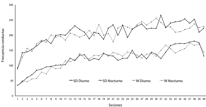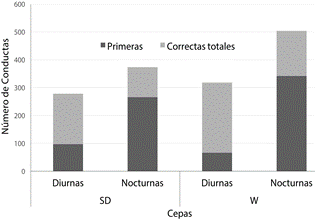 Durante las sesiones del entrenamiento previo lo sujetos de ambas cepas realizaron un promedio de conductas en un rango similar. Aunque la cepa SD, tuvo un rendimiento ligeramente menor (M = 179.3, DE = 40.51) que la W (M = 194.9, DE = 89.99), las comparaciones estadísticas no indican diferencias significativas entre cepas (F1,39 = 0.355, p > .05), ni entre las condiciones noche-día (F1,39 = 0.827, p > .05), como tampoco en la interacción hora del día - cepa (F1,39 = 0.635, p > .05). Estos y los análisis posteriores siempre fueron hechos con el número absoluto de conductas, como medida de variable dependiente.