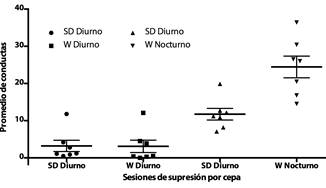 En las sesiones diurnas los sujetos de cepa SD realizaron un promedio de 208.1 conductas por sesión, mientras que los sujetos W realizaron 205.5 promedio en cada sesión. Durante las sesiones nocturnas los sujetos Sprague-Dawley realizaron un promedio diario de 123.5, y los sujetos Wistar realizaron un promedio de 122 por sesión (Figura 2). No se encontraron diferencias entre cepas (F1,39 = .02, p > .05), aunque sí respecto del día subjetivo (F1,39 = 80.16, p < .001), pero no en la interacción de día subjetivo - cepa (F1,39 = 0, p > .05). Los datos no consideran la presión de la palanca inactiva pues no estaba presente en la fase de entrenamiento.