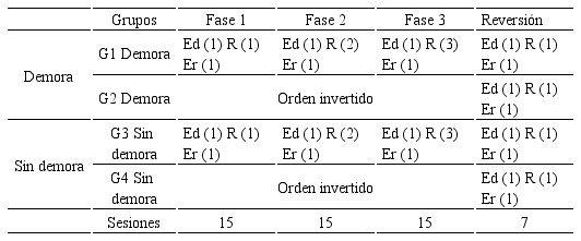 Se empleó un diseño de replicación intrasujeto (Arnau, 1990) en la modalidad reversible multivariable (Castro, 1977). Los grupos se diferenciaron por el orden en el que los sujetos fueron expuestos a las condiciones experimentales a través de las fases y por la entrega inmediata o demorada del reforzador.