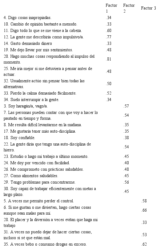 El primer factor, compuesto por 11 ítems (α = .81) representa una capacidad general de la persona para refrenar conductas e impulsos y fue denominada Control no reflexivo de los impulsos. El segundo factor, compuesto por 12 ítems (α = .76) agrupa aspectos referidos a la capacidad de trabajar eficazmente y comprometerse con objetivos personales, y fue llamado Autodisciplina. El tercer factor, aúna 5 ítems (α = .69) que hacen referencia a la capacidad de resistir a la tentaciones o actividades placenteras que se evalúan como malas o contrarias a los objetivos personales a largo plazo. Esta subescala fue denominada Control reflexivo de los impulsos puesto que hace referencia a la capacidad de los sujetos de reconocer los riesgos de las conductas y actuar en consecuencia de dicha evaluación. Finalmente, el Alpha de Cronbach total para los 28 ítems de la escala fue de .84. Las correlaciones de los factores entre sí, y con el puntaje total de la EAC se presentan más adelante en la Tabla 3. Los indicadores de ajuste del modelo fueron buenos (CFI = .96; AGFI = .95; RMSEA = .05).