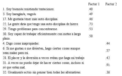 El primer factor, compuesto por 6 ítems, agrupa aspectos referidos a la capacidad de trabajar eficazmente y comprometerse con objetivos personales, y fue llamado Autodisciplina (α = .67). El segundo factor, compuesto por 5 ítems, representa la capacidad general de la persona para refrenar conductas e impulsos y fue llamada Control de los Impulsos (α = .65). La confiabilidad total de la EAC-A fue adecuada (α = .75). Los indicadores de ajuste del modelo fueron muy buenos (CFI = .99; AGFI = .98; RMSEA = .035).