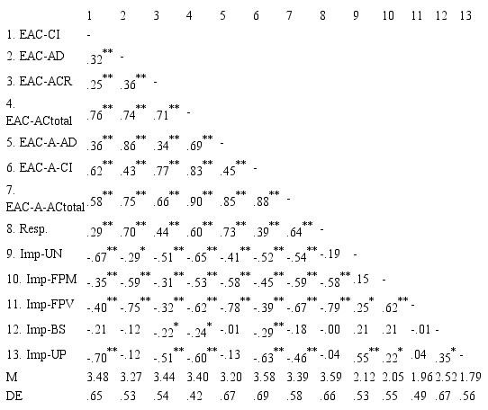 Para analizar la validez concurrente y convergente del instrumento se calcularon los totales por participante de las 3 subescalas sugeridas previamente para la EAC, así como la sumatoria total de los 28 ítems retenidos para la EAC. También se calcularon los dos factores de la EAC-A y el puntaje total de la misma. Se evaluaron las correlaciones de los indicadores anteriores con el rasgo de personalidad Responsabilidad (Consciousness) del modelo de los Cinco Grandes Factores de Personalidad, y con las cinco dimensiones de la Impulsividad. Los resultados de las correlaciones realizadas sobre los valores obtenidos por la segunda muestra, se muestran en la Tabla 3. Conjuntamente, se muestran las correlaciones de las escalas y las subescalas entre sí (tanto de la EAC como de la EAC-A) para los resultados de la muestra total, así como los estadísticos descriptivos correspondientes.