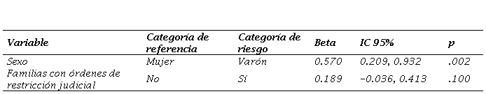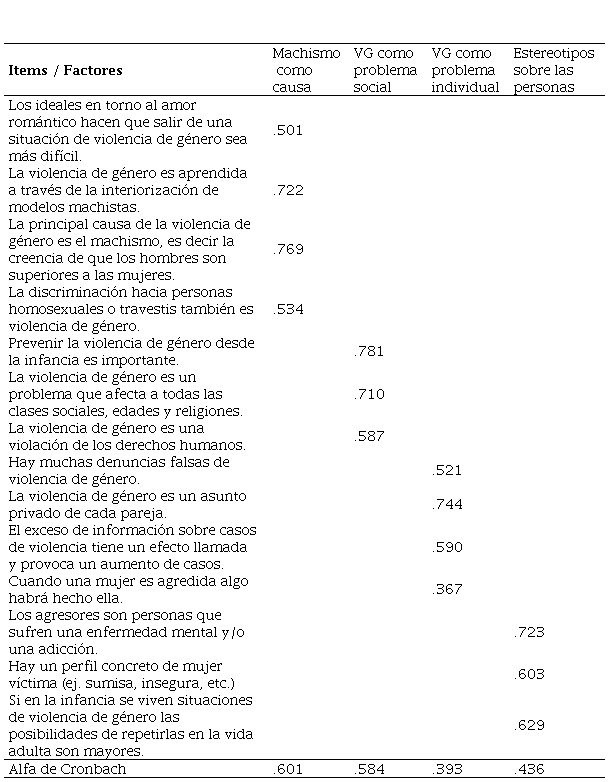 El primer factor lo llamamos “Machismo como causa” e integra cuatro preguntas que identifican al machismo como el principal origen de la VG (“los ideales en torno al amor romántico hacen que salir de una situación de violencia de género sea más difícil”, “la violencia de género es aprendida a través de la interiorización de modelos machistas”, “la principal causa de la violencia de género es el machismo, es decir la creencia de que los hombres son superiores a las mujeres” y “la discriminación hacia personas homosexuales o travestis también es violencia de género”). El alfa de Cronbach de este factor fue .601. El segundo factor lo llamamos “la violencia de género como problema social” e integra tres preguntas sobre la VG comprendida como una problemática cuya causa es social (“prevenir la violencia de género desde la infancia es importante”; “la violencia de género es un problema que afecta a todas las clases sociales, edades y religiones” y “la violencia de género es una violencia de los derechos humanos”). El alfa de Cronbach de este factor fue .584. El tercer factor lo llamamos “la violencia de género como problema individual” e integra cuatro preguntas sobre creencias de que la VG se debe a problemáticas de la esfera privada de las personas (“hay muchas denuncias falsas de violencia de género”; “la violencia de género es un asunto privado de cada pareja”; “el exceso de información sobre casos de violencia tiene un efecto llamada y provoca un aumento de casos” y “cuando una mujer es agredida algo habrá hecho ella”). El alfa de Cronbach de este factor fue .393. El cuarto factor lo llamamos “estereotipos sobre las personas” e integra tres preguntas que reflejan estereotipos vinculados a quienes sufren y/o ejercen VG (“los agresores son personas que sufren una enfermedad mental y/o una adicción”; “hay un perfil concreto de mujer víctima (ej. sumisa, insegura, etc.); “si en la infancia se viven situaciones de violencia de género las posibilidades de repetirlas en la vida adulta son mayores”). El alfa de Cronbach de este factor fue .436. Las tablas 2, 3, 4 y 5 muestran las relaciones crudas y ajustadas de todas las variables con cada factor para el conjunto de la muestra.