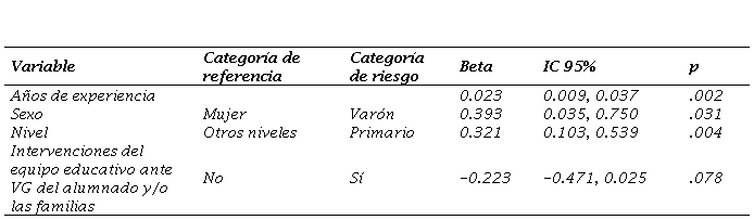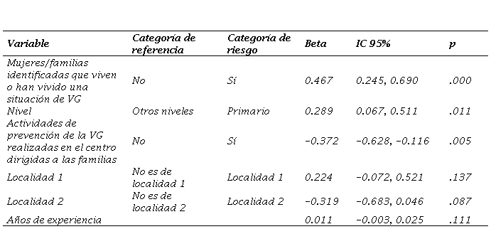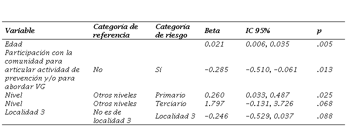 Ser hombre y trabajar como profesional en el nivel primario se vinculan a dimensiones opuestas de la escala. Por ejemplo, los varones consideran al machismo como causa de la VG a la vez que valoran más los estereotipos sobre las personas o bien, los docentes que trabajan en el nivel primario entienden que la VG es un problema social pero a la vez valoran más los estereotipos. Quienes han tenido casos identificados de VG o han realizado reuniones con la comunidad asocian más la VG con una problemática social. A mayor edad y años de antigüedad los estereotipos sobre las personas en relación a la VG y pensar la VG como un problema individual tienen mayor asociación. Si bien las asociaciones no alcanzan la significación estadística, los datos indican que dos localidades alejadas de la capital de la Provincia consideran a la VG como un problema social, mientras que otra de las localidades estudiadas, también alejada de la Capital, asocia la VG con estereotipos.