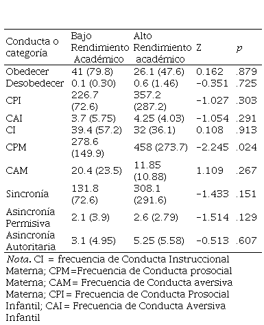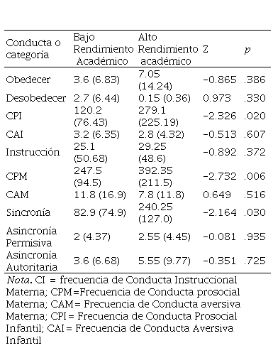 Con el fin de poner a prueba la hipótesis de que las diadas con alto rendimiento académico presentarían mayor frecuencia de intercambios sincrónicos que las diadas con bajo rendimiento académico, se realizaron comparaciones de la frecuencias de cada categoría conductual, tanto de la madre como la del niño, por medio de la prueba no paramétrica U de Mann-Whitney. Esto se realizó considerando que la distribución de las variables no se ajusta a la normalidad y las muestras obtenidas no son representativas de la población. Para determinar el grado de relación entre las categorías conductuales maternas, la frecuencia de eventos sincrónicos y asincrónicos autoritarios y permisivos, sobre las categorías infantiles se realizaron análisis de correlación por medio de la prueba no paramétrica de Spearman. El paquete estadístico empleado fue el STATISTICA, en su versión 7.