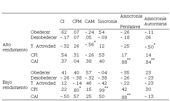 Para determinar si la conducta materna y la condición de sincronía presenta una relación con la disposición de los niños a obedecer y con la frecuencia de conducta prosocial y aversiva infantil, se realizaron análisis de correlación entre las variables maternas y las infantiles durante la fase de actividad académica, cuyos valores de correlación se observan en la tabla 3.