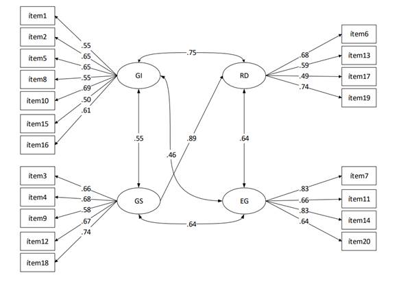 Los valores superiores a .94 obtenidos de los índices de ajuste, confirman el modelo de veinte reactivos distribuidos en cuatro dimensiones. El valor de RMSEA de .68 (90% CI .06-.07) y el χ2gl = 2.69, también apuntan a un buen ajuste del modelo. Además, la combinación del valor de SRMR de .09 junto al valor de CFI de .96, indican un buen ajuste del modelo (Hu & Bentler, 1999).