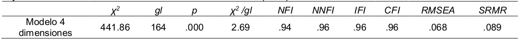 En la tabla 1 pueden observarse los valores correspondientes a los índices de ajuste evaluados: X2/gl, NFI, NNFI, IFI, RMSEA y SRMR.
