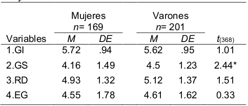 Nota: GI = gratitud interpersonal; GS = gratitud ante el sufrimiento; RD = reconocimiento de dones; EG = expresión de gratitud. *. < .05.