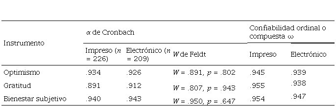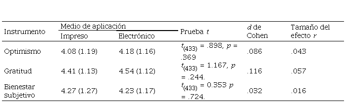 Se esperaba que las medias obtenidas fueran similares, independientemente del medio de aplicación que se utilizara. Los resultados no mostraron diferencias significativas entre las medias de la aplicación electrónica y la impresa de las tres escalas (optimismo, gratitud y bienestar subjetivo). Estos hallazgos concuerdan con los obtenidos por Bagby et al. (2013), Read et al. (2009) y Karay et al. (2015), en cuyos estudios los puntajes de las aplicaciones en línea y en papel tampoco difirieron.