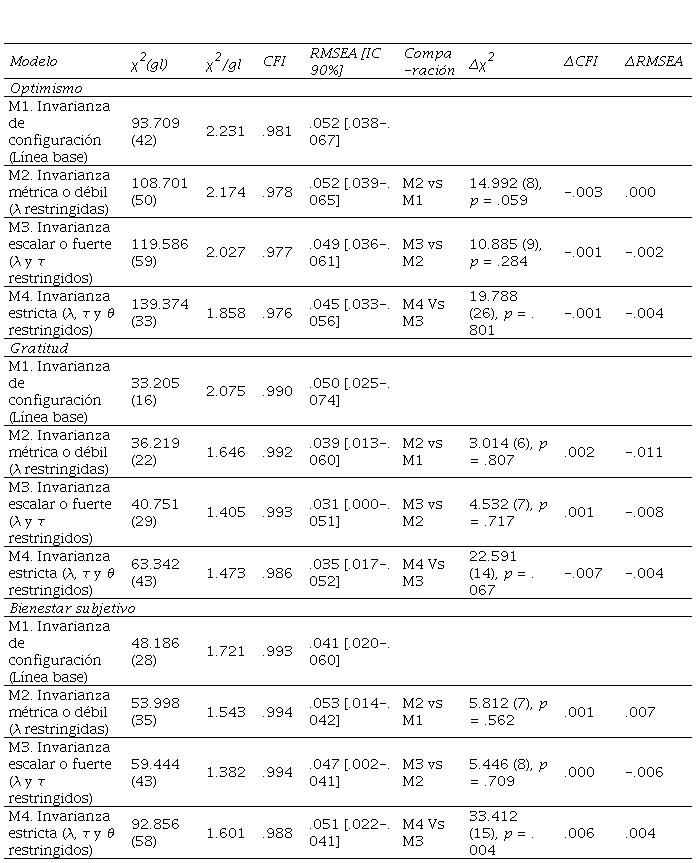 Los AFC ratificaron las soluciones unifactoriales para las tres escalas, con índices de ajuste por arriba de los criterios de corte (descritos en la sección de Análisis de los datos), los cuales se muestran en los modelos de línea base de la tabla 3. En todos los casos, la varianza media extraída resultó > .60 y fue similar en las aplicaciones electrónicas e impresas; en las escalas de Optimismo y Bienestar subjetivo fueron ligeramente más altas en las versiones impresas (.631 y .726, respectivamente) que en las electrónicas (.620 y .690, respectivamente), en tanto que, en la escala de Gratitud, el valor fue levemente más alto en el formato electrónico (.632) que en el impreso (.607).