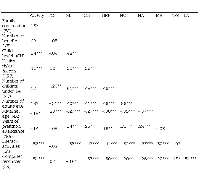 The correlation analysis between the independent variables and poverty resulted in low and non-significant associations between them, except for the association between literacy activities and poverty, where the association was moderate (Table 1).