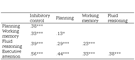Results from the correlation analysis between the dependent variables showed non-significant associations, except for the relation among executive attention and inhibitory control, where the association was moderate (Table 2).