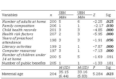 UBN homes had more adults at home (z = -2.25; p = .025). Children from SBN conditions were more likely to be in the care of a single person (z = -2.17; p = .030). Children from UBN homes had more child health (z = -4.85; p = .000) and health risk factors (z = -5.95; p = .000). In addition, in comparison to children from the SBN group, the children from the UBN group yielded the following findings: (a) almost one more year of preschool attendance (z = -1.91; p = .056); (b) fewer books at home and lower frequency of book reading to children (z = -7.87; p = .000); (d) lower frequency of computer and internet use (z = -7.13; p = .000); and (e) younger mothers (f = 5.28; p = .023). There were no significant differences in the other variables analyzed (Table 3).