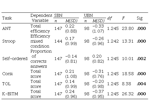 As expected, comparisons between BN groups showed that the UBN group obtained significantly lower efficacy levels and scores in most variables analyzed: executive attention, visuo-spatial working memory, inhibitory control, planning, and fluid reasoning. The SBN group obtained significantly lower efficacy in object spatial working memory (Table 4).