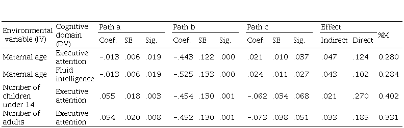 (a) The effects of maternal age on executive attention and fluid reasoning were totally mediated by poverty; (b) the effects of children at home and adults at home on executive attention were largely mediated by poverty (Table 5).
