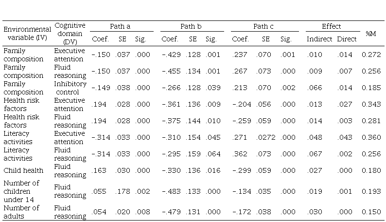 (a) The effects of family composition on executive attention, fluid reasoning, and inhibitory control were partially mediated by poverty; (b) the effects of health risk factors on executive attention and fluid reasoning were partially mediated by poverty; (c) the effects of literacy activities on executive attention and fluid reasoning were partially mediated by poverty; (d) the effects of child health, children at home, and adults at home on fluid reasoning were partially mediated by poverty (Table 6).