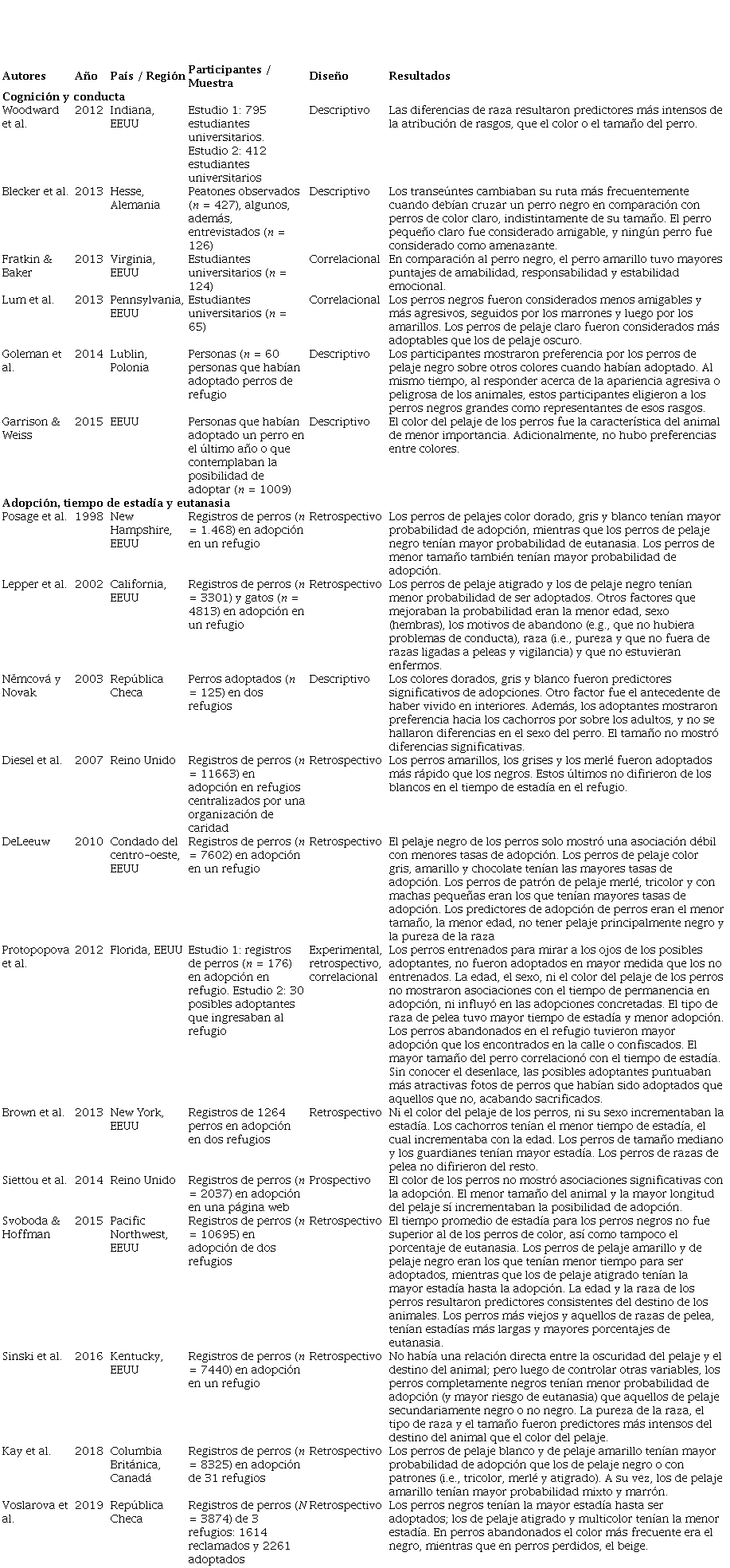 Las investigaciones fueron organizadas en dos grupos: por un lado, aquellas que analizaron la influencia del pelaje negro de los perros sobre distintos aspectos de la cognición y conducta humana en general, y por otro lado, aquellas que analizaron directamente las tasas de adopción (ver Tabla 1).
