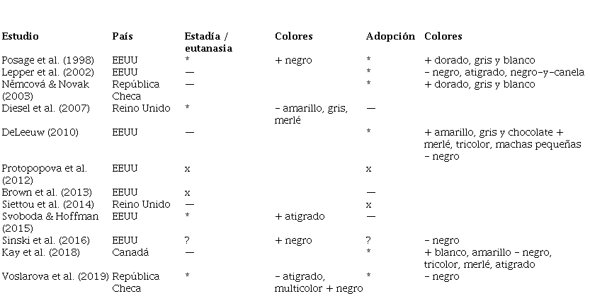 Otros estudios evaluaron la influencia del color del pelaje de perros de refugios en la probabilidad de ser adoptados, en el tiempo que eso implicaba, o bien, en la probabilidad de ser sacrificados, dependiendo de las políticas de cada institución. Las diferencias significativas y no significativas se consignan en la Tabla 2.