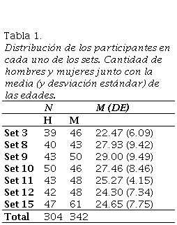 Siguiendo las pautas planteadas en el Reporte Técnico A-8 (Lang et al., 2008), en el que se presentan el manual de instrucciones y los baremos del IAPS para población americana, se definió la muestra y la conformación de los grupos. Se conformó una muestra intencional, ajustándose a los lineamientos del estudio original (Lang et al., 2008) y de las validaciones realizadas en otros países. En dichos estudios cada imagen del IAPS es evaluada en sus tres dimensiones por un grupo de entre 80 y 100 participantes, los cuales son estudiantes universitarios. Participaron del presente estudio 646 (set 3: n = 85; set 8: n = 83; set 9: n = 93; set 10: n = 96; set 11: n = 91; set 12: n = 90; set 15: n = 108) estudiantes universitarios entre los 18 y 58 años de edad, de los cuales un 47% (n = 304) eran hombres y un 53% (n = 342) mujeres. La media de edad fue de 25.86 años (DT = 7.52) (ver tabla 1). En todos los casos, los participantes firmaron el consentimiento informado tomando conocimiento de la investigación y aceptando su participación en la misma.