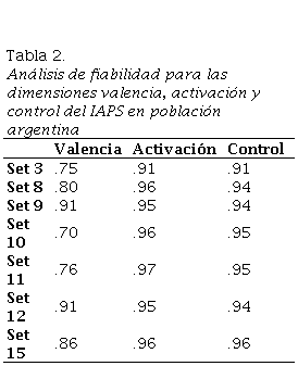 En conclusión, las tres dimensiones del IAPS evidenciaron adecuados índices de consistencia interna en los nuevos siete sets de imágenes estudiados. Se incluyen de este modo, los datos normativos para población argentina, pudiendo ser aplicado el IAPS en contextos de investigación, tanto básica como aplicada. Y se suma de este modo, nuevo material para ser utilizado en el área del estudio de la emoción en nuestro país.