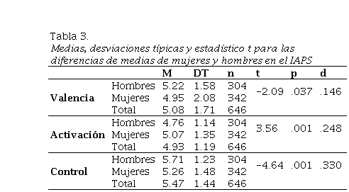 En la tabla 3 se presentan los estadísticos descriptivos y las diferencias de medias para hombres y mujeres. Con un nivel de significación del 1%, no se hallaron diferencias significativas para la dimensión valencia, y sí para las dimensiones activación y control comparando los grupos de mujeres y hombres.