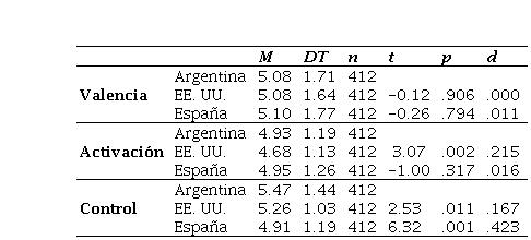Al comparar entre el total de los sujetos de cada país, no se observan diferencias en la dimensión valencia. Con respecto a la activación, solo se observan diferencias en relación a la muestra de Estados Unidos y no así con la de España. Los puntajes en activación son más altos en Argentina y España que en Estados Unidos. Por último, en cuanto al nivel de sensación de control, sí se hallaron diferencias entre las puntuaciones de Argentina y las de Estados Unidos y España, siendo las de Argentina las más altas de todas.