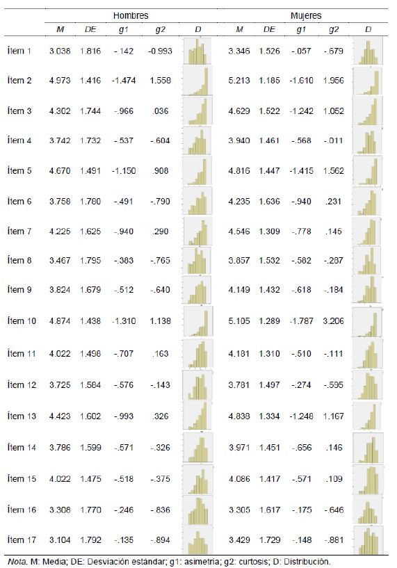 Por otro lado, en cuanto a la invarianza de medición, ambas versiones (17 y 9 ítems) son prácticamente equivalentes entre hombres y mujeres en vista de la magnitud de sus índices de ajuste, así como su variabilidad entre modelos anidados (Tabla 2).