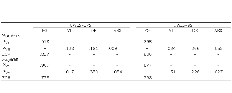 En cuanto al análisis bifactor-ESEM llevado a cabo con cada grupo, el ajuste fue favorable en hombres (UWES-17S: CFI17 = .986; RMSEA17 = .067, IC90% = .049, .085; WRMR17 = .414; UWES-9S: CFI. = 1.000; RMSEA. = .000, IC90% = .000, .092; WRMR. = .125) y mujeres (UWES-17S: CFI17 = .979; RMSEA17 = .074, IC90% = .062, .086; WRMR17 = .538; UWES-9S: CFI. = 1.000; RMSEA. = .000, IC90% = .000, .051; WRMR. = .098), destacando la versión de nueve ítems con mejores estadísticas. Asimismo, en todos los casos las magnitudes del ωh, ωhs y ECV indican que el FG de EA recibe suficiente respaldo y que las dimensiones específicas no serían interpretables (Tabla 2).