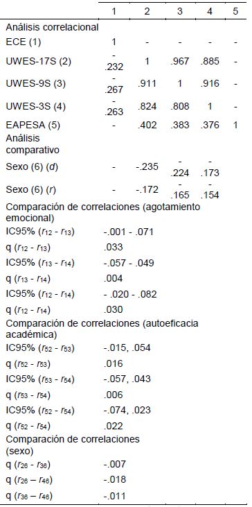 En segundo lugar, la equivalencia de la asociación de las tres versiones con una medida de agotamiento emocional académico y autoeficacia académica fue analizada mediante dos enfoques basados en la comparación estadística de cada par de correlaciones (e.g., UWES-17S con AE y UWES-3S con AE). El primer enfoque consiste en un método que estima el intervalo de confianza (IC) para la diferencia entre correlaciones dependientes, es decir, que tienen elementos en común (Zou, 2007), siendo en este caso el elemento común la medida de agotamiento emocional académico o de autoeficacia académica. Entonces, si el IC incluye al cero es un indicador de que no existen diferencias entre las correlaciones; y el segundo enfoque hace uso de la . (Cohen, 1992) que estima la magnitud de las diferencias para dos correlaciones, siendo triviales aquellos indicadores menores que .10.