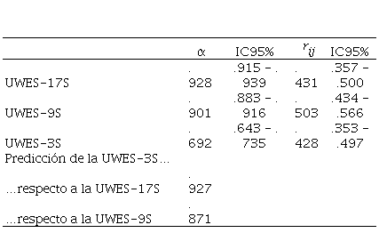 Luego de ello, se analizaron las evidencias de equivalencia entre la UWES-17S, UWES-9S y UWES-3S con la muestra completa haciendo uso de análisis correlacionales. En primer lugar, se asoció cada par de versiones (e.g., UWES-17S con UWES-3S) pero al contener elementos comunes la correlación se corrigió (Levy, 1967).