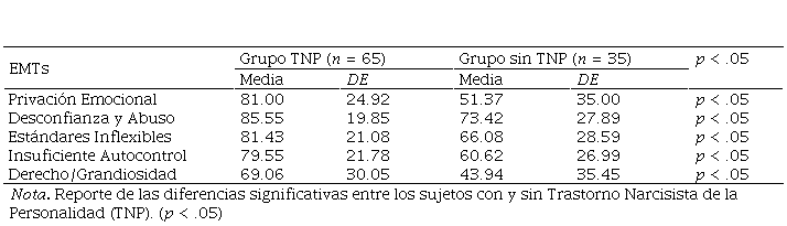 Los EMTs Insuficiente Autocontrol y derecho/grandiosidad se asocian al crecimiento de los sujetos en familias que propiciaron el desarrollo de una creencia de superioridad. Esta creencia puede traer dificultades en la vida adulta con respecto a la autodisciplina y el respeto por los derechos de los demás (Rafaeli et al., 2010), lo cual es coincidente con el sentido grandioso de autoimportancia que poseen los sujetos con TNP y el hecho de que sean ajenos a las necesidades de los otros y prontos a la satisfacción de las propias (American Psychiatric Association, 1994).