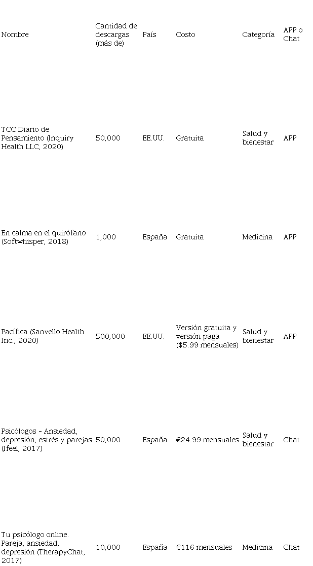 Se encontraron cinco aplicaciones que cumplieron los criterios de inclusión (ver Tabla 1). Ninguna de las aplicaciones presentó en su descripción poseer estudios científicos que las avalen, aun las que mencionaron estar basadas en técnicas psicológicas o realizadas por psicólogos. De las cinco aplicaciones seleccionadas, tres fueron creadas en España y dos en Estados Unidos. Dentro de la clasificación de tienda Google Play Store de Android, dos pertenecían a la categoría “Medicina” y las tres restantes, a “Salud y bienestar”. Dos de las aplicaciones encontradas son chats, no aplicaciones en sí, que permitían el contacto con profesionales de la salud.
