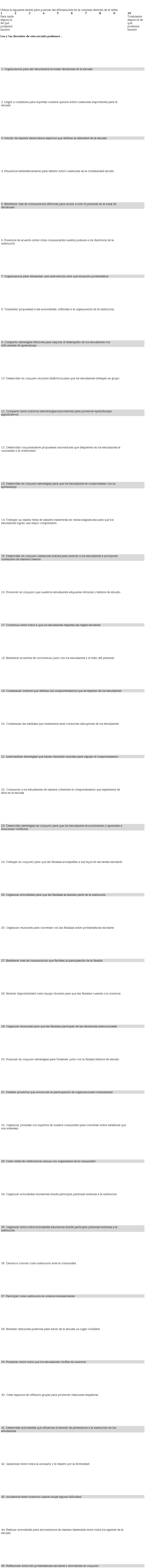 La respuesta a los ítems se realizó en una escala tipo Likert para indicar el grado en que los docentes creían que podían llevar a cabo esas conductas desde (1) para nada seguro/a de que podemos hacerlo hasta (10) totalmente seguro/a de que podemos hacerlo. Bandura (2006) sugirió emplear respuestas de 1 a 10 puntos para lograr mayor sensibilidad y predictibilidad, ya que las personas suelen evadir las posiciones extremas, por lo que una escala de pocos puntos podría reducir el rango de respuestas a uno o dos puntos.