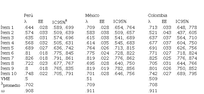 No existió un alejamiento significativo de la normalidad multivariada en los tres grupos (G2México = 9.565; G2Colombia = 9.698; G2Perú = 12.087). El ajuste del modelo unidimensional alcanza magnitudes aceptables del CFI y WRMR en los tres países (CFIPerú = .945, WRMRPerú = 1.386; CFIMéxico = .940, WRMRMéxico = 1.323; CFIColombia = .948, WRMRColombia = 1.125), a diferencia del RMSEA que excedió lo establecido con relación al límite superior de su intervalo de confianza en Perú (RMSEA = .124, IC 90% [.111, .138]), México (RMSEA = .131, IC 90% [.116, .146]) y Colombia (RMSEA = .121, IC 90% [.104, .139]). Por otro lado, se puede apreciar (Tabla 1) que la magnitud de las cargas factoriales fue de moderada a alta en las tres muestras (λpromedio > .70) y el límite inferior de su intervalo de confianza fue mayor que .50 en casi todos los casos, la varianza media explicada en cada grupo es adecuada (VME ≥ .50) y la confiabilidad del constructo excelente (ω > .90).
