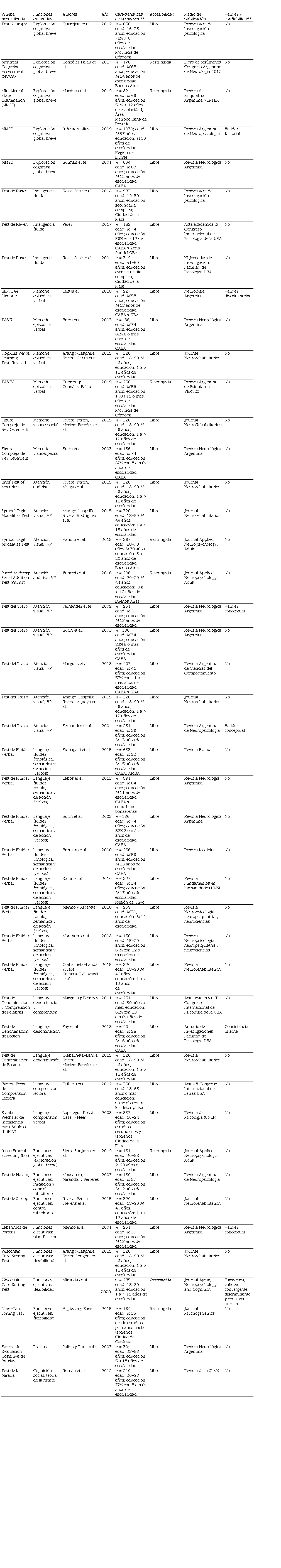 En resumen, la literatura científica advierte que las pruebas cognitivas, de gran utilidad entre otros aspectos, para la detección temprana de deterioro cognitivo y demencia, deben ser empleadas conforme a datos normativos de cada contexto sociocultural. Con la intención de facilitar la tarea a profesionales evaluadores de Argentina, y al mismo tiempo, informar a investigadores sobre los avances y limitaciones en investigación normativa local, el objetivo del presente trabajo consistió en relevar estudios normativos argentinos sobre pruebas cognitivas para adultos, haciendo un rastreo en el período 2000-2020.