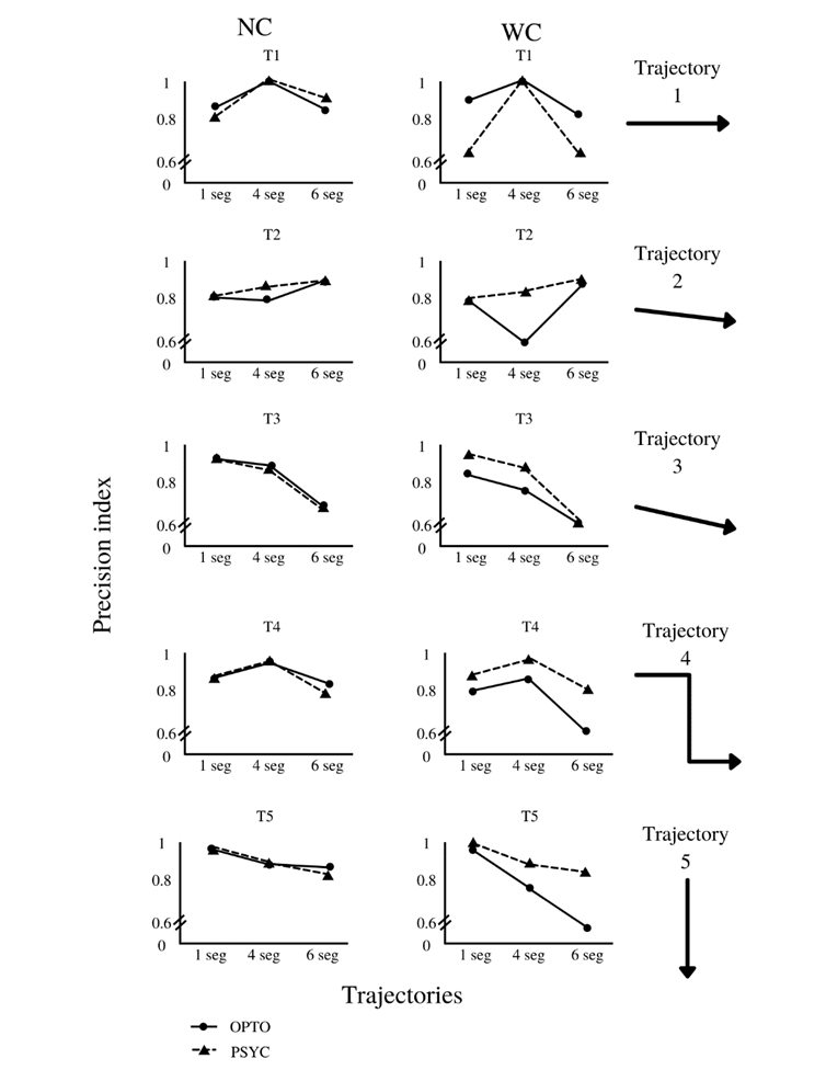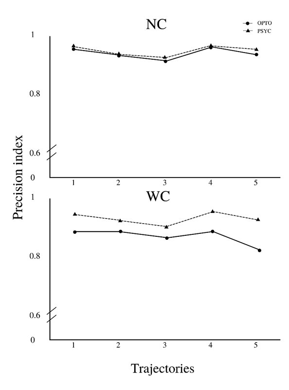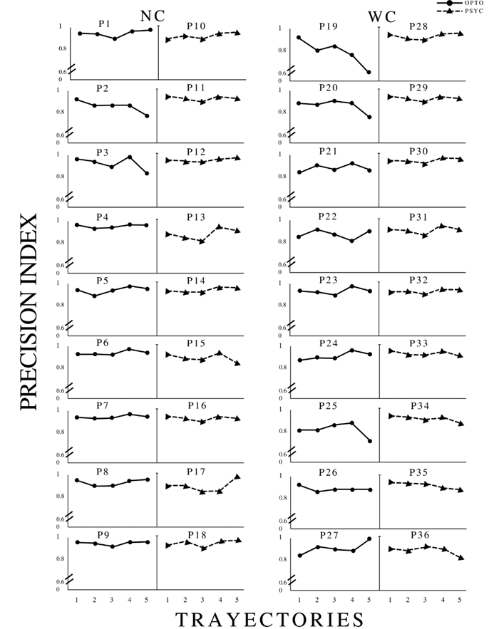 Figure 3 shows the precision index obtained by each individual participant on each trajectory. Optometry students are represented by continuous lines and psychology students are represented by dashed lines. Left panel shows the data for students who did not receive verbal consequences (NC). On the other hand, right panel shows the data for students who did receive verbal consequences (WC). Figure 4 shows the group average for the same data but averaged per group.