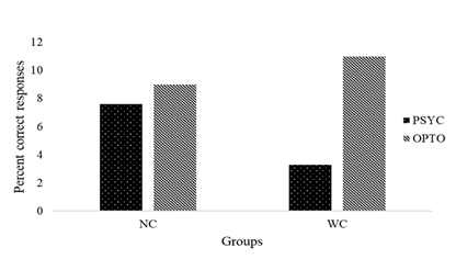 Finally, Figure 6 shows the average percent of correct responses (SUE = 0) for each group. This plot shows that percent correct responses was always higher for optometry students, and this difference was even bigger when students received verbal consequences.