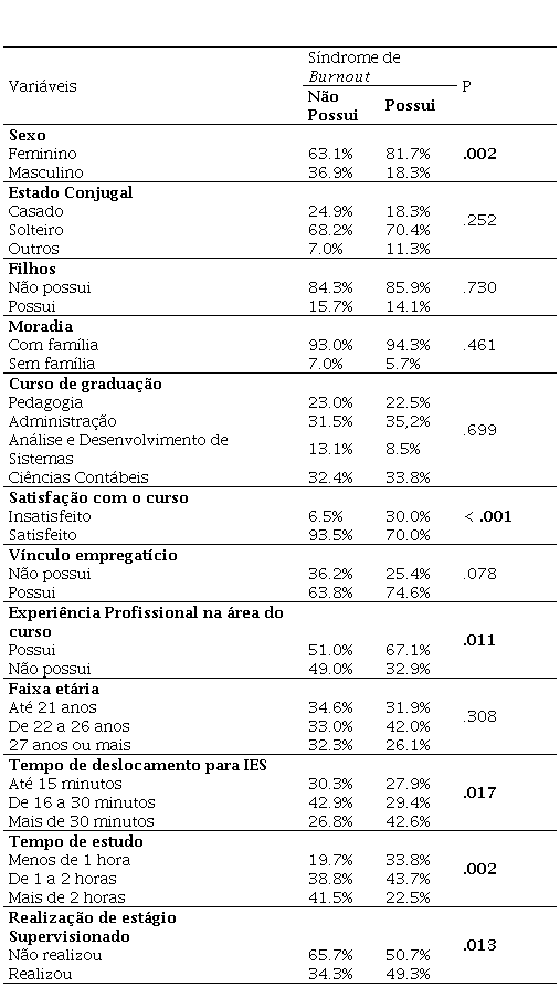 Os resultados evidenciaram que houve maior associação da síndrome de Burnout entre estudantes do sexo feminino (81.7%) e entre aqueles que estavam insatisfeitos com o curso (30.0%), que possuíam experiência profissional na área do curso (67.1%), que, para se deslocar até a instituição, despendiam tempo superior a 30 minutos (42.6%), que estudavam de uma a duas horas diárias fora do horário acadêmico obrigatório (43.7%); que realizavam estágio supervisionado (50.7%).