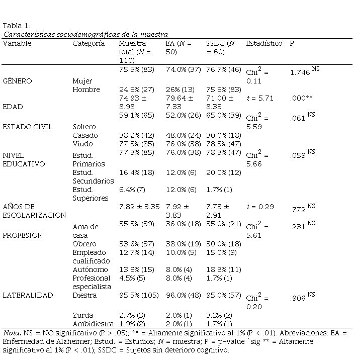 El grupo 1 está compuesto por 50 pacientes con EA de diferente grado de severidad (EA leve, n = 17; EA moderada, n = 17 y EA moderadamente grave, n = 16), 37 mujeres (33.63 %) y 13 hombres (11.81 %) con EA cuya edad media es de 79.64 años (DE= 7.33). El grupo 2 está formado por 60 SSDC, 46 mujeres (41.81 %) y 14 hombres (12.72 %) sanos, cuya edad media es 71.00 años (DE= 8.34). Ambos grupos están equilibrados en cuanto a tamaño con p > .05 (χ2(1) = 0.91; p = .340). No existen diferencias estadísticamente significativas entre los diferentes grupos con p > .05 en el género, estado civil, lateralidad, nivel de escolarización y años de escolarización y profesión, por lo que ambos grupos son equivalentes en dichas variables, a excepción de la variable edad (t = 5.71; p < .001), de forma que los sujetos del grupo de comparación son más jóvenes (71 años) que los casos con EA (79.6); diferencia que se estima al 95% de confianza entre 5.6 y 11.64 años (Tabla 1).