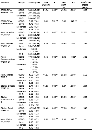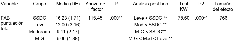 Puntuación total de la Batería de evaluación frontal (FAB). Al analizar el rendimiento ejecutivo global en función del grado de severidad se constata la existencia de las diferencias altamente significativas para p < .001 con, incluso, un tamaño del efecto fuerte (.766). Estas diferencias se confirman con la alternativa no-paramétrica de KW. Los test múltiples a posteriori indican que los casos con EA sean cual sea su nivel puntúan por debajo de los SSDC, así como que entre los tres grados de severidad también hay diferencias significativas (f = 115.45; p < .001) de manera que se puede comprobar que cuanto más elevado sea el grado de severidad, menor es la puntuación alcanzada en la variable (Tabla 2).
