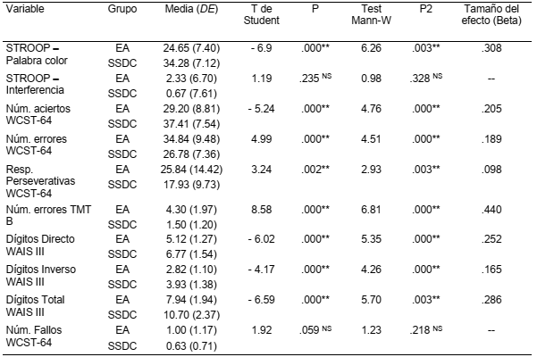 Abstract: The objective of the study was to investigate the Executive Functions (EF) in patients with Alzheimer's Disease (AD) according to the degree of severity. 50 patients with AD and 60 Subjects Without Cognitive Impairment (SWCI) were studied in a non-experimental-cross-sectional study with a non-probabilistic sampling. The results showed that: the execution of the digit test that assesses working memory does not differentiate between patients with mild AD and SWCI; inhibitory control, evaluated by the Stroop test, allows differentiating patients with AD in moderate and severe phase; and in cognitive flexibility, measured through different variables, there are inconsistent differences. Patients with AD are more affected in tasks that assess working memory, inhibitory control and cognitive flexibility, regardless of the degree of severity and age, compared with SWCI.