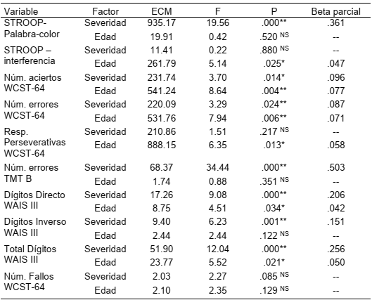 Puntuación en la condición Palabra-Color (STROOP). Los sujetos con EA tienen una media (Tabla 3) que es significativamente menor (t = -6.90; p < .001) que las medias de los SSDC, con un tamaño del efecto elevado (.308). Analizando según el grado de severidad (Tabla 4) se siguen encontrado diferencias significativas (f = 21.94; p < .001) con un tamaño del efecto algo superior al ya indicado (.385). Los test a posteriori señalan que las medias de todos los casos con EA en cualquier nivel son inferiores (p < .01) a los SSDC; y además que los EA moderadamente grave tienen una media menor (p < .01) tanto con los EA leve como incluso con los EA moderada. Al controlar la edad (Tabla 5) se comprueba que esta no tiene efecto alguno (p. > .05) y que por ello no modifica los resultados anteriores (f = 19.56; p < .001) con un tamaño del efecto que sigue siendo elevado (.361).