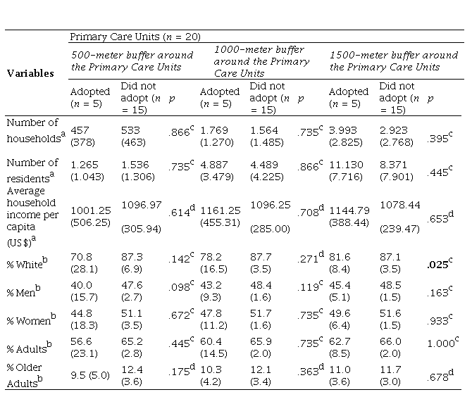 We geo-referenced the eligible UBS units (n = 20) through their addresses using the Google Earth Pro platform. We established three network buffer sizes to verify the UBS surrounding characteristics based on the accessibility of walking routes near each UBS (Lopes, Hino, Moura, & Reis, 2018). The UBS socio-demographic characteristics were calculated based on the 2010 census (Instituto Brasileiro de Geografia e Estatística, 2011). We analyzed the number of households, number of residents, average household income per capita, racial and ethnic distributions, the proportion of men, proportion of women, proportion of adults, and proportion of older adults. Geospatial analyses were performed using the ArcGIS 10.5 software.