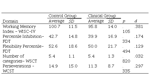 In order to analyze the performance of the two groups (clinical and experimental) in the EFs, the number of categories and perseverative responses of the WCST, WISC-IV (Working Memory Index) and the percentages of inhibitory control and flexibility obtained in the FDT test (Table 1), have been utilized.